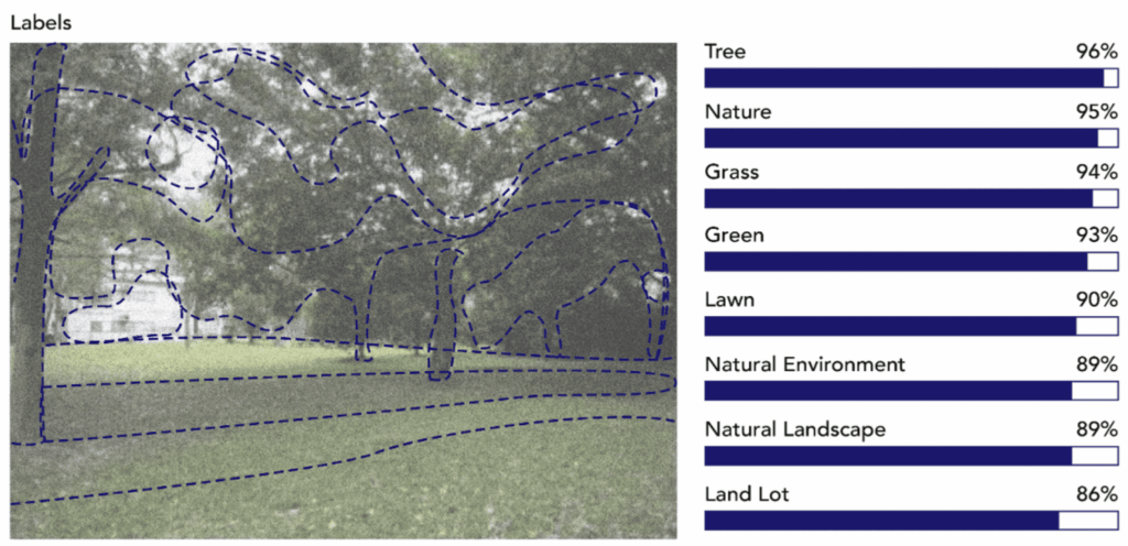 Furthermore, by understanding how these specific design choices influence users’ reactions, AI can become a powerful tool for designers. Research by Shih-Han Hung and Chun-Yen Chang at the University of Auckland’s Future Cities Research Hub sought to bridge the gap between biophilic design and user well-being while simultaneously showcasing the potential of AI. The research utilized AI to analyze landscape elements and then to predict the Total Environment Quality (TEQ) and related health benefits that biophilic labels (such as trees, plants, grass, and parks) could provide in comparison to urban-related labels.
