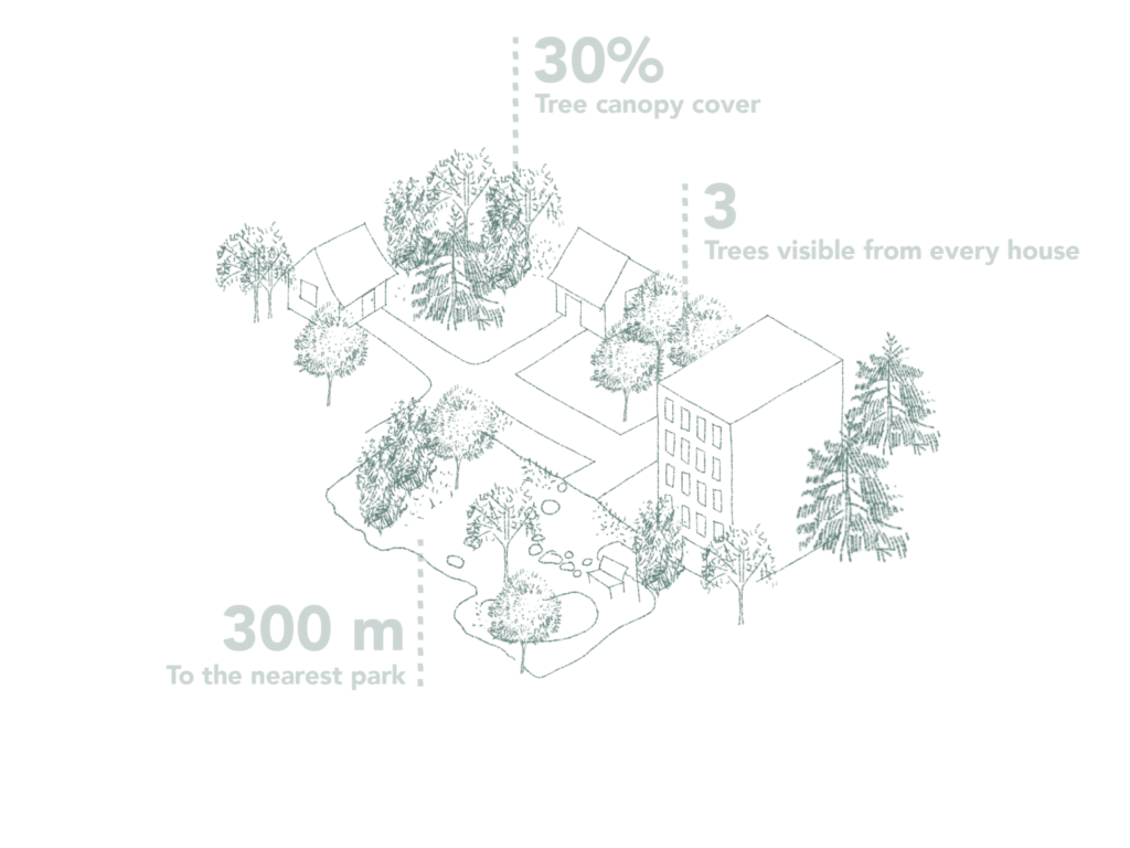 The first rule sets that every citizen should be able to see at least three trees (of a decent size) from their home, the second one has been deducted from studies that have shown an association between urban forest canopy and, for example, cooling, better microclimates, mental and physical health, and possibly also reducing air pollution and noise.