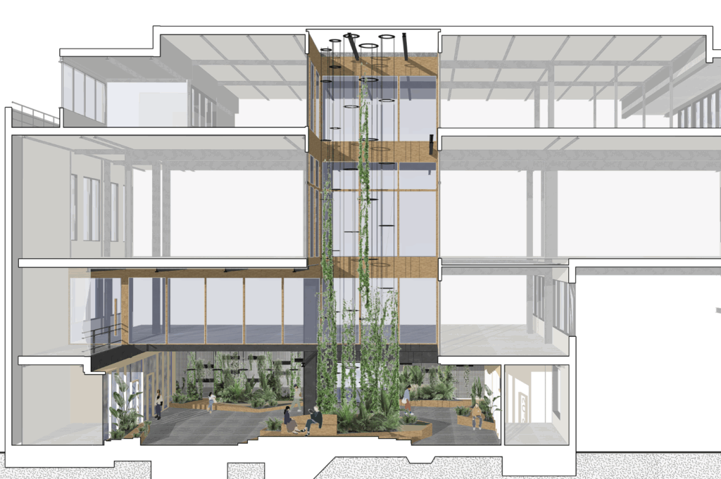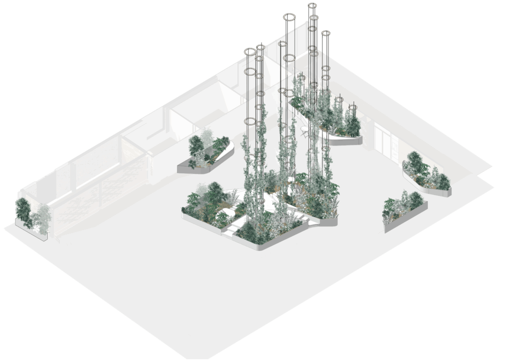 MOSS’s greenery creates zones for collaboration, focus, and relaxation, integrating interior planters with long wire trellises to support climbing plants that enhance verticality and create a striking visual impact.