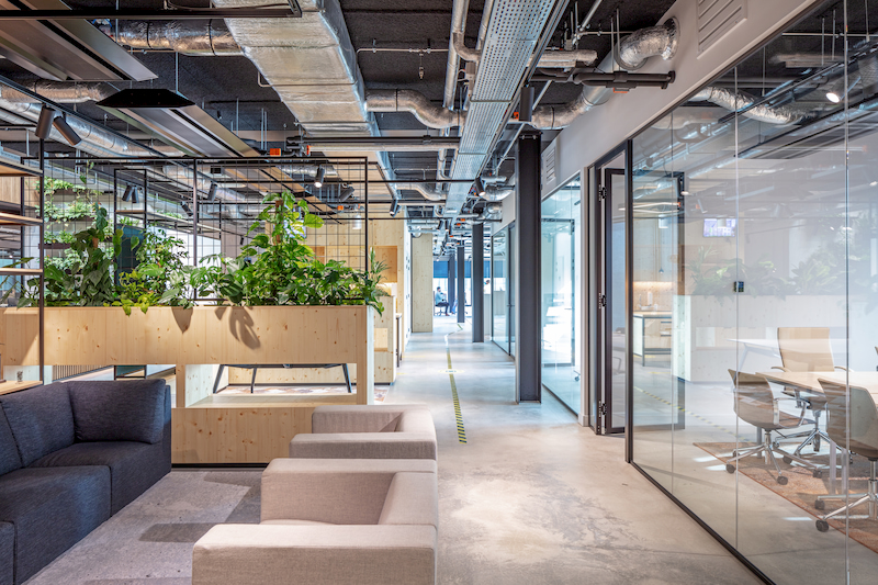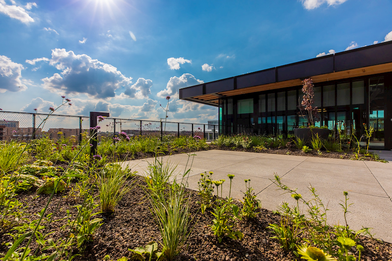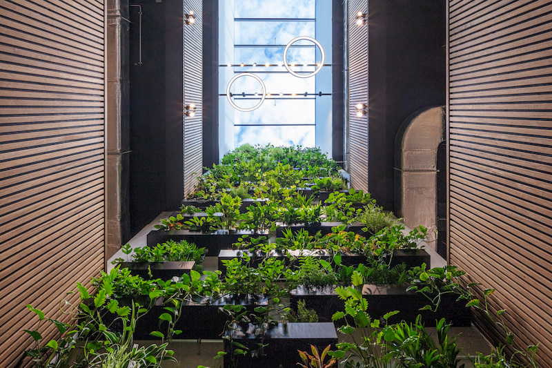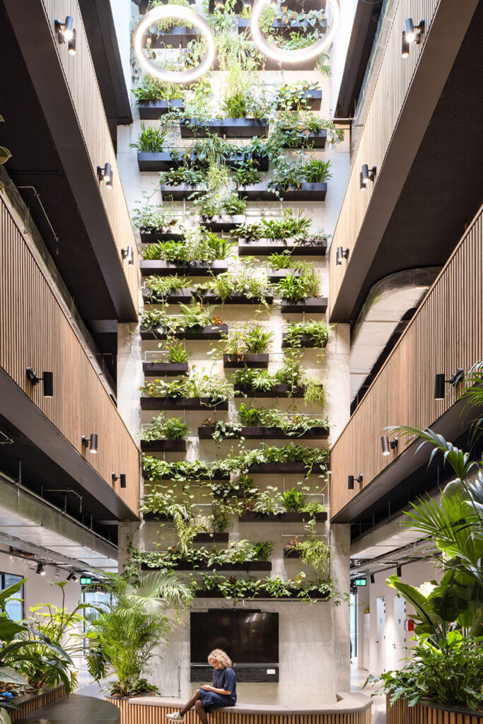 We introduced greenery throughout the building with indoor gardens, a lush four-story green planter wall, and a green roof.
