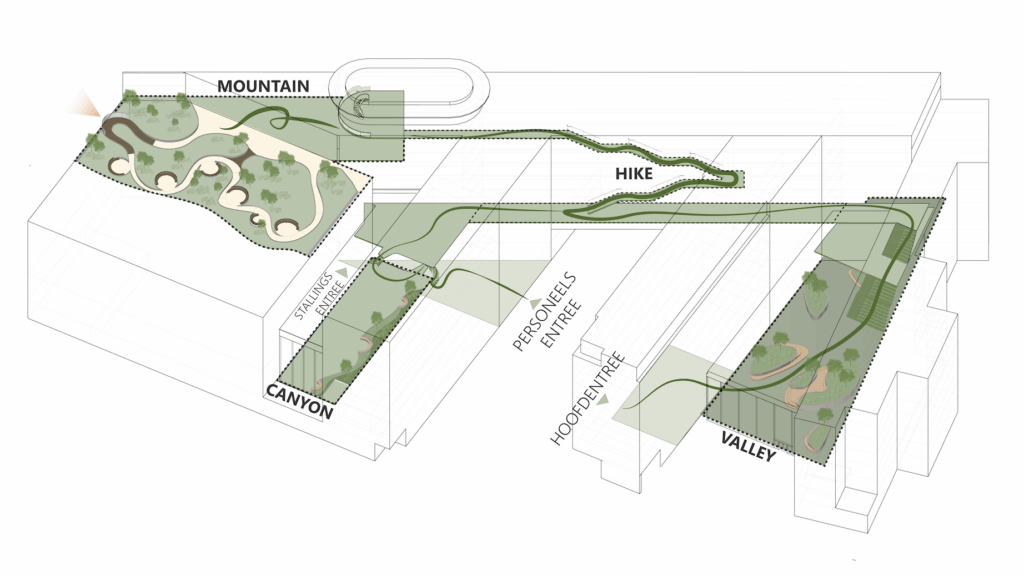 For Haagse Veste, MOSS and the rest of the design team developed a green design concept that drew on inspiration from natural topography to create a spatial journey through four main elements: The Valley, the Canyon, the Hike, and The Mountain. The intention was to create a narrative landscape, inviting users to connect with nature throughout the building.