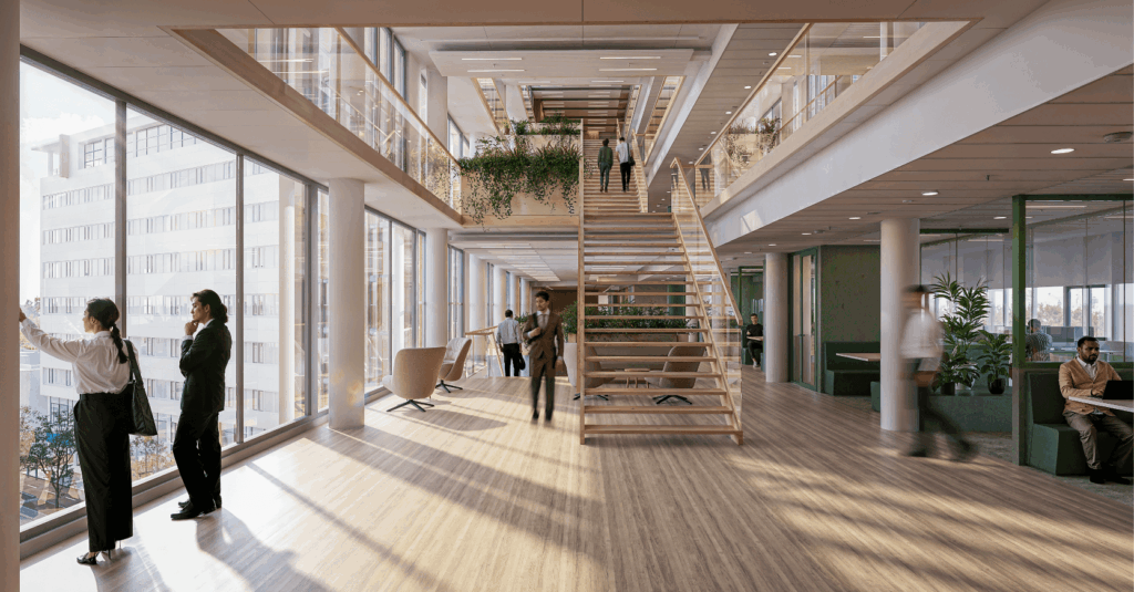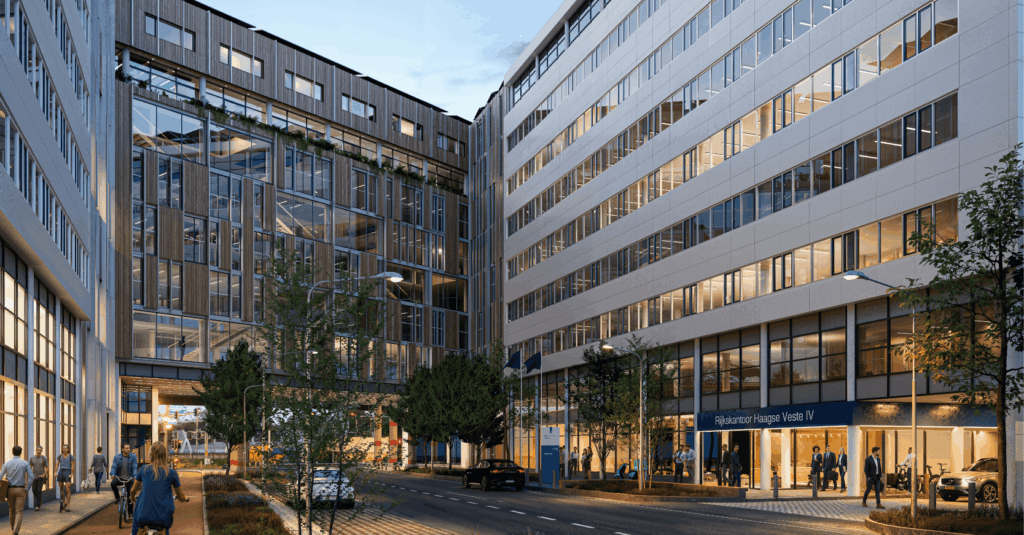 In The Hague, the Central Government Real Estate Agency (RVB) is redeveloping Rijkskantoor Haagse Veste IV together with an integrated consortium led by Hegeman Bouw & Infra. RU+PA and Sweco are the architects, while De Groot Installaties and DWA develop the energy and installation concepts, and IMD and Repurpose focus on structural engineering and circular material strategies. MOSS was asked to design the green concept for the interior and rooftop levels, supporting the project’s sustainability and user-experience goals.