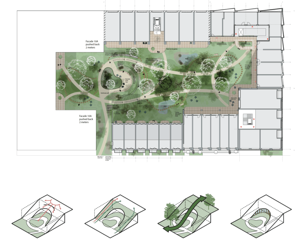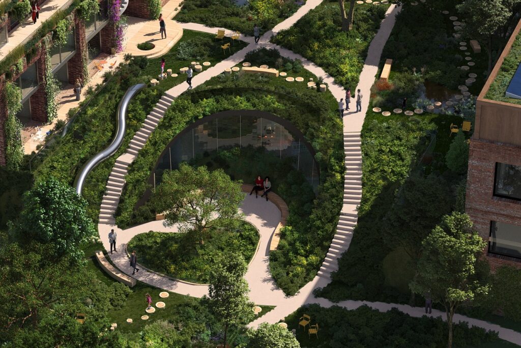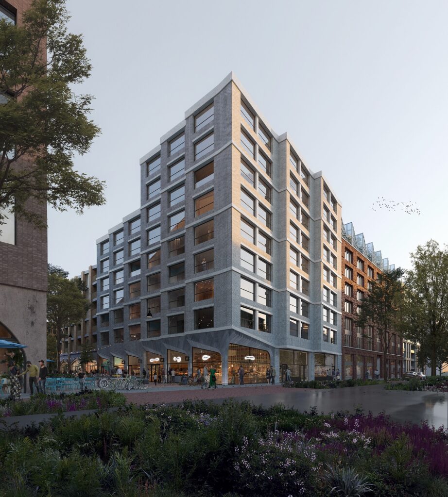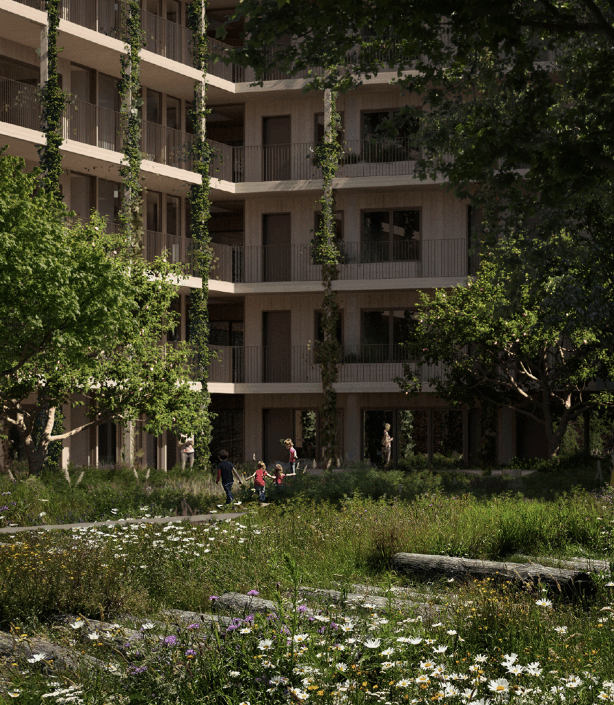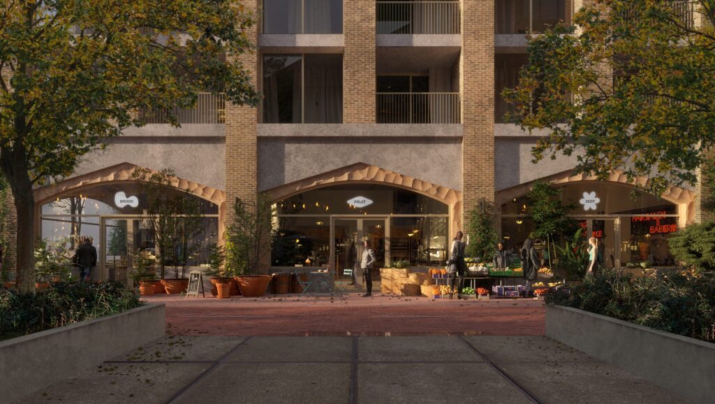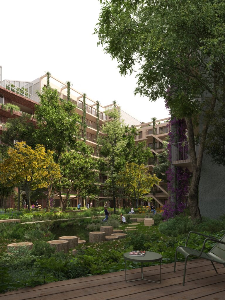 For this tender in Amsterdam’s Amstelkwartier, MOSS joined a multidisciplinary team led by Koschuch Architects and Studio RAP to design De Smaakmaker. This envisioned 122 new homes, a supermarket, retail, and shared community spaces, built with circularity in mind. MOSS was responsible for the full landscape and ecological design — from a lush central courtyard to green roofs and a rooftop greenhouse.