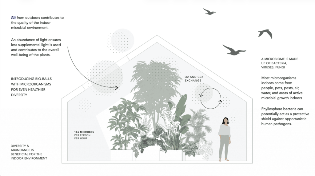Built environment practitioners can play their part and encourage healthier indoor spaces by accommodating a more diverse range of microbes. This can partly be achieved by increasing the amount of greenery introduced in a space. We can start shaping our buildings by selecting microbes that have a beneficial effect on us. This process has also been referred to as “bioinformed design” (Yong, 2018).