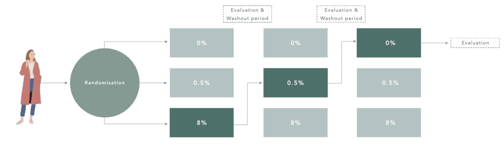 A crossover experimental design was applied to obtain more insights into the effect of 3 different volumes of indoor greenery on employee well-being. To find out more about what a crossover experiment is and why it is the selected method, check out MOSS LAB 1.0.