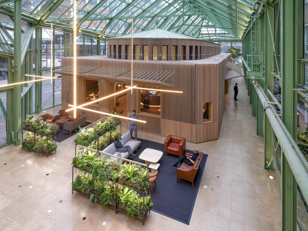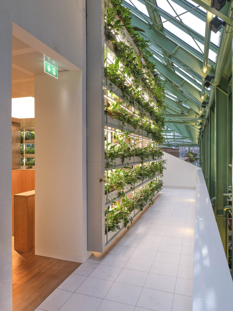The Orangerie uses a cohesive thread of green to connect two restored pavilions, while the central stair encourages communal interaction. This is intended to reconcile the building’s historic character with modern needs of healthy, plant-filled workspaces.