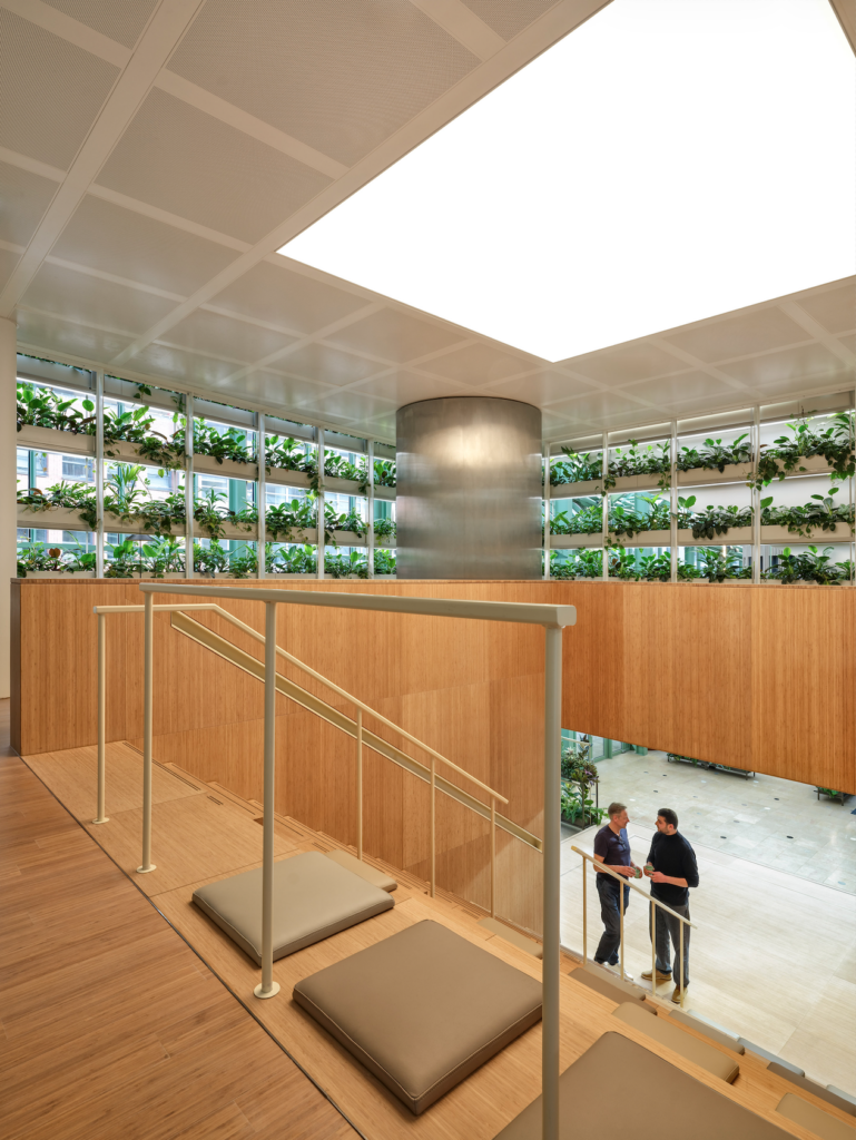 In the Orangerie, different uses of greenery are incorporated to improve air quality, acoustics, and thermal comfort. Plants are integrated into a stacked planter system to create a prominent green wall hanging over the central staircase. Movable green cabinetry adds flexibility to social spaces to enhance concentration and create a pleasant and flexible workspace.